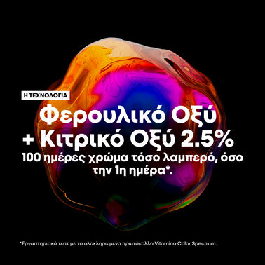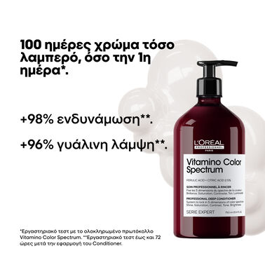 Vitamino Color Spectrum Επαγγελματικό Conditioner από τη L’Oréal Professionnel, εμπλουτισμένο με Φερουλικό Οξύ + Κιτρικό Οξύ 2.5%. 100 ημέρες χρώμα τόσο λαμπερό, όσο την 1η ημέρα*. Αποδεδειγμένη αποτελεσματικότητα στις 5 διαστάσεις χρώματος**: