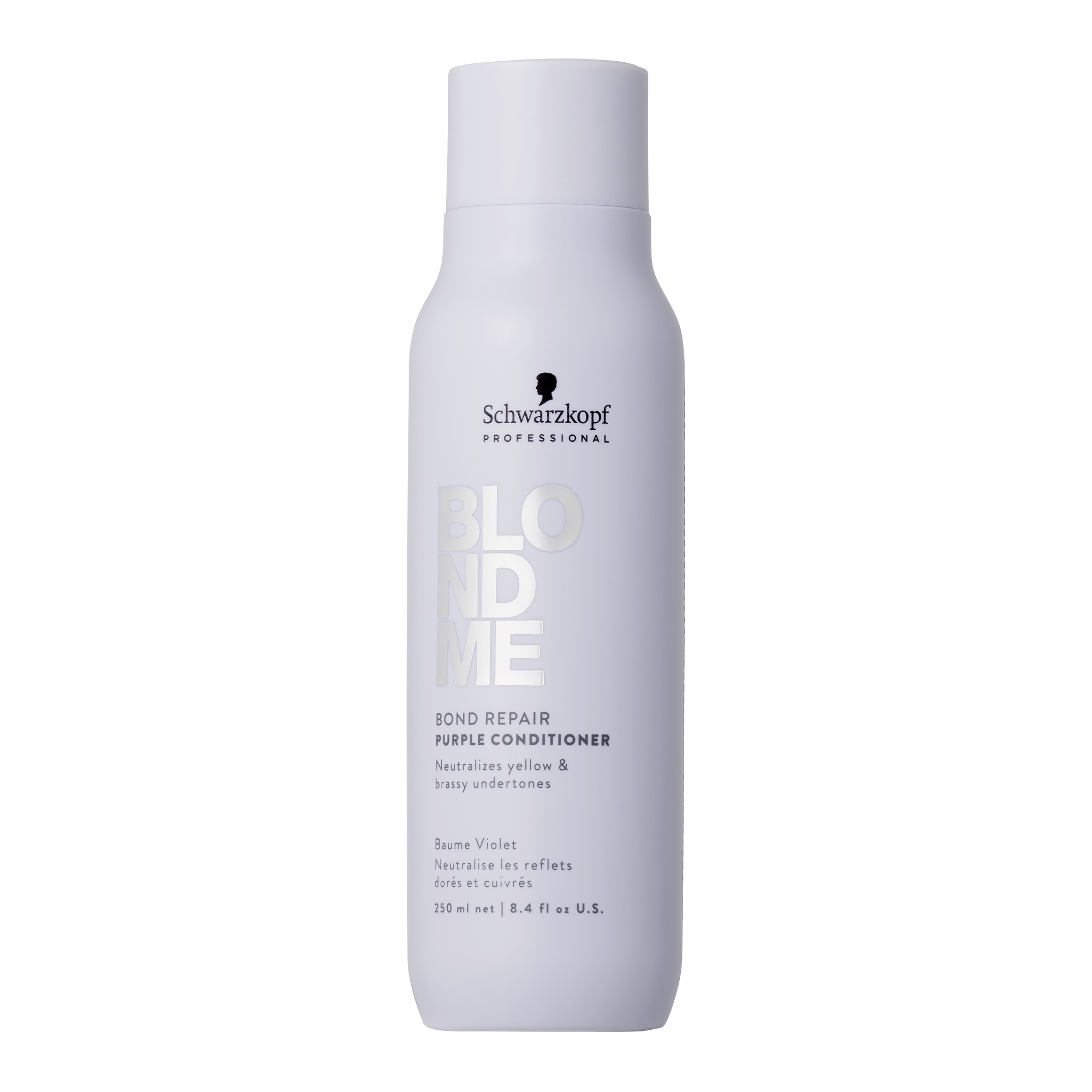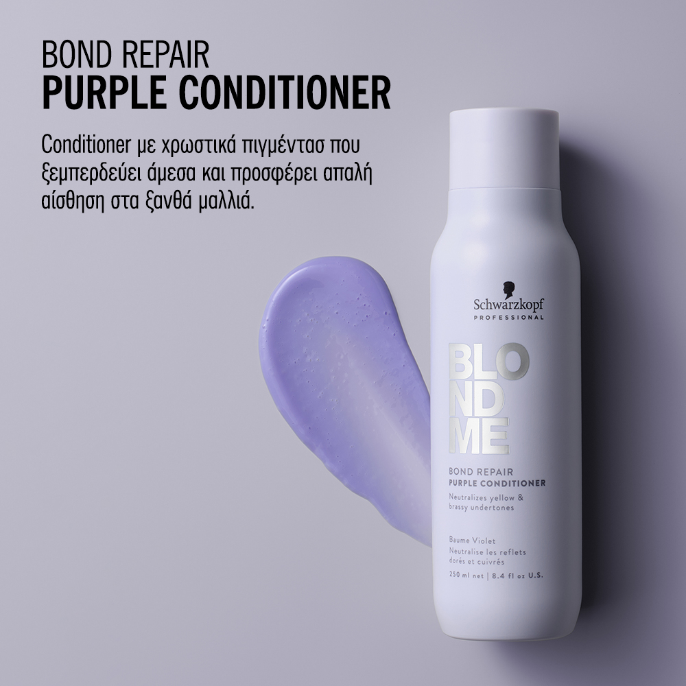 Το BLONDME Bond Repair Purple Conditioner με Τεχνολογία BOND REPAIR εξουδετερώνει τους κίτρινους δευτερεύοντες τόνους και αποτρέπει την εμφάνιση χάλκινων τόνων, χαρίζει απαλότητα στα μαλλιά ενώ ξεμπερδεύει άμεσα τα μαλλιά στα μήκη και τις άκρες προσφέροντας μεταξένια αίσθηση. Με σύνθεση εμπλουτισμένη με Αμυγδαλέλαιο και Άνθος Αραβοσίτου, προσφέρει στοχευμένα επίπεδα ψυχρών πιγμέντων για να διατηρήσει μια ψυχρή κατεύθυνση τόνου, διατηρώντας τη βελτιωμένη ξανθιά διαύγεια χωρίς να αλλάζει το χρώμα των μαλλιών. Αναζωογονεί τα θαμπά μαλλιά, προσφέρει λάμψη, τα ενδυναμώνει χτίζοντας τους εσωτερικούς δεσμούς της τρίχας, επανορθώνοντας τη φθορά που ισοδυναμεί με δυο υπηρεσίες ξανοίγματος μετά από μόλις μια χρήση.