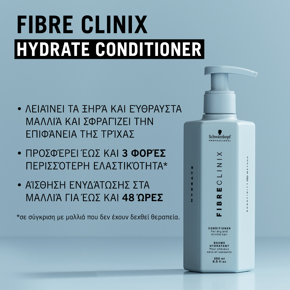 - Η σειρά Fibre Clinix Hydrate με τη σύνθεση με ηλεκτρολύτες επαναφορτίζει τα μαλλιά προσφέροντας μια αίσθηση ενυδάτωσης και αναζωογονεί τις ξηρές τούφες, αφήνοντας τα μαλλιά ενυδατωμένα, απαλά και μεταξένια.