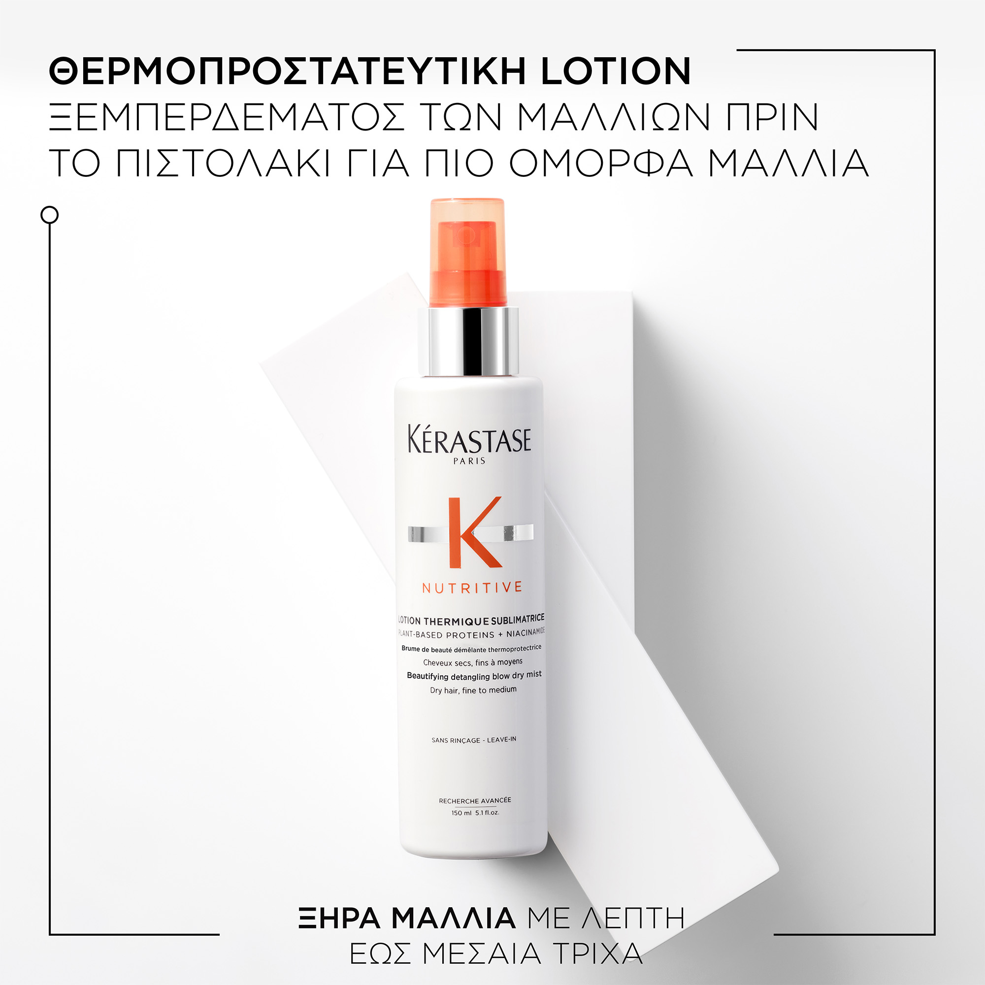 Η Lotion Thermique Sublimatrice της Kérastase είναι μια θερμοπροστατευτική λοσιόν για εύκολο ξεμπέρδεμα & styling για ξηρά μαλλιά με λεπτή έως κανονική τρίχα. Αυτή η λοσιόν περιέχει θρεπτικά λιπίδια που ενυδατώνουν και θρέφουν σε βάθος την τρίχα, καθώς και απαραίτητα θρεπτικά συστατικά που ενισχύουν τις θρεπτικές και ενδυναμωτικές ιδιότητες της σύνθεσης..