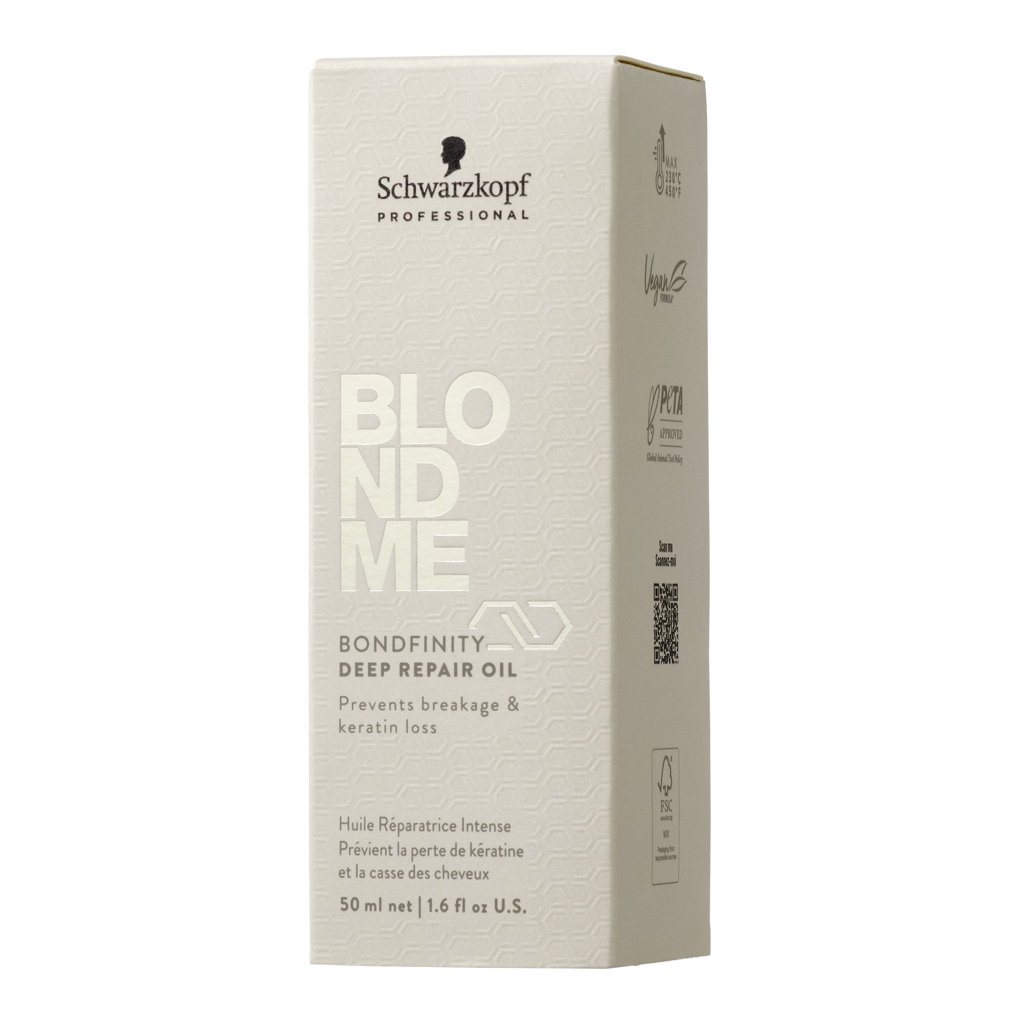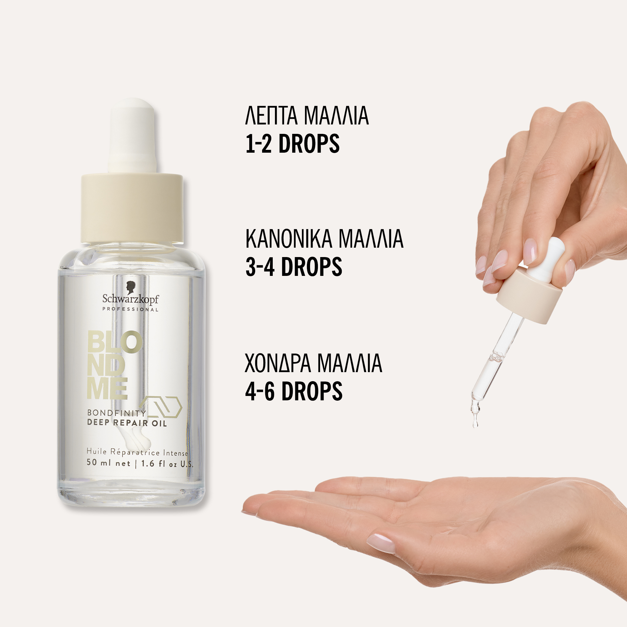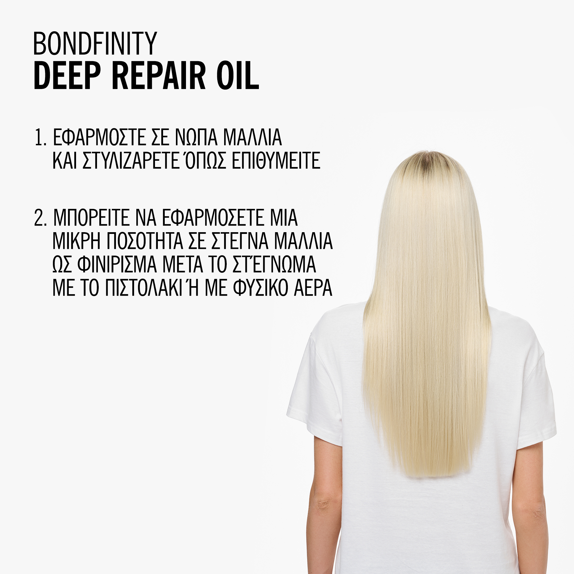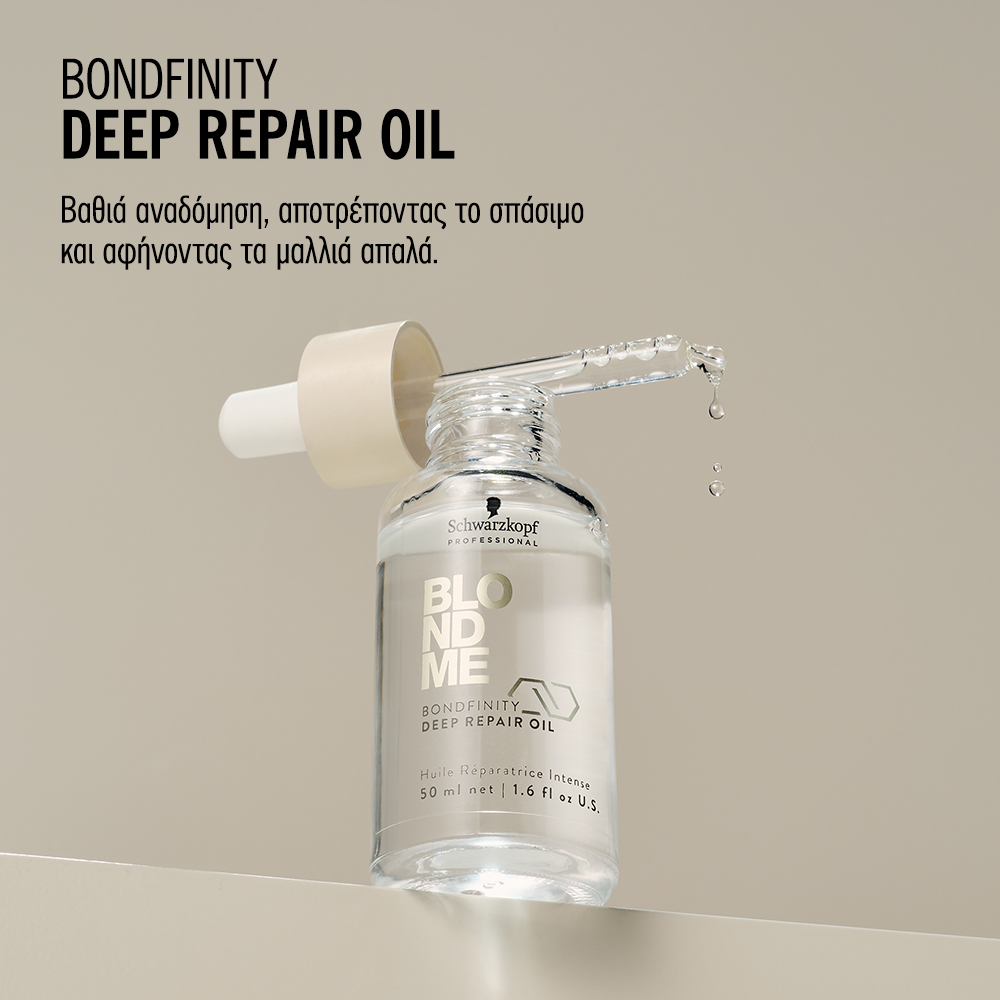 Το BLONDME Deep Repair Oil με Τεχνολογία BONDFINITY επανορθώνει σε βάθος και ενδυναμώνει τα ξανθά και ξανοιγμένα μαλλιά χωρίς να τα βαραίνει, επαναφέροντας την υγεία των μαλλιών δημιουργώντας ανθεκτικούς δεσμούς στην τρίχα και κλειδώνοντας την κερατίνη της τρίχας. – προλαμβάνει τη μελλοντική φθορά των μαλλιών και τα μαλλιά είναι 7 φορές πιο δυνατά μετά από μόλις μια χρήση. * Επιπλέον χαρίζει απαλότητα στα πορώδη μαλλιά και προσφέρει όμορφη λάμψη, χάρη στον 24ωρο έλεγχο φριζαρίσματος και τα προστατεύει τη θερμότητα και τη φθορά των εργαλείων styling.