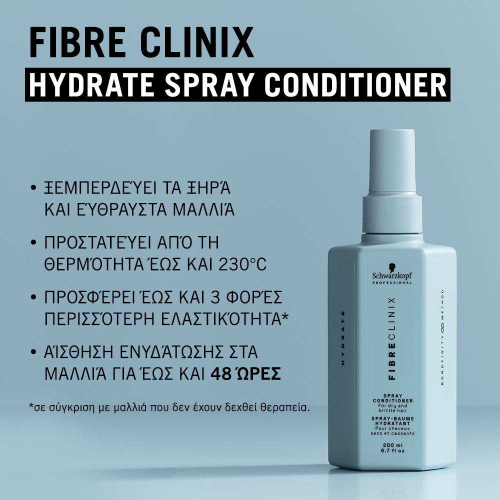 Το Fibre Clinix Hydrate Spray Conditioner με ενσωματωμένη Τεχνολογία BONDXTENT ενδυναμώνει τα μαλλιά και δημιουργεί δεσμούς στο εσωτερικό μέρος της ίνας της τρίχας. Είναι ένα ενυδατικό spray conditioner επανόρθωσης που λειαίνει και ξεμπερδεύει τα ξηρά και εύθραυστα μαλλιά, και προστατεύει από τη θερμότητα έως και 230°C. Η σύνθεση με ηλεκτρολύτες, κλειδώνει άμεσα την ενυδάτωση στις ίνες της τρίχας προσφέροντας απαλότητα, λάμψη και ελαστικότητα χωρίς να βαραίνει τα μαλλιά, ενώ βελτιώνει τη διαχειρισιμότητα για πιο ευκολοχτένιστα μαλλιά και προστασία από το φριζάρισμα.
