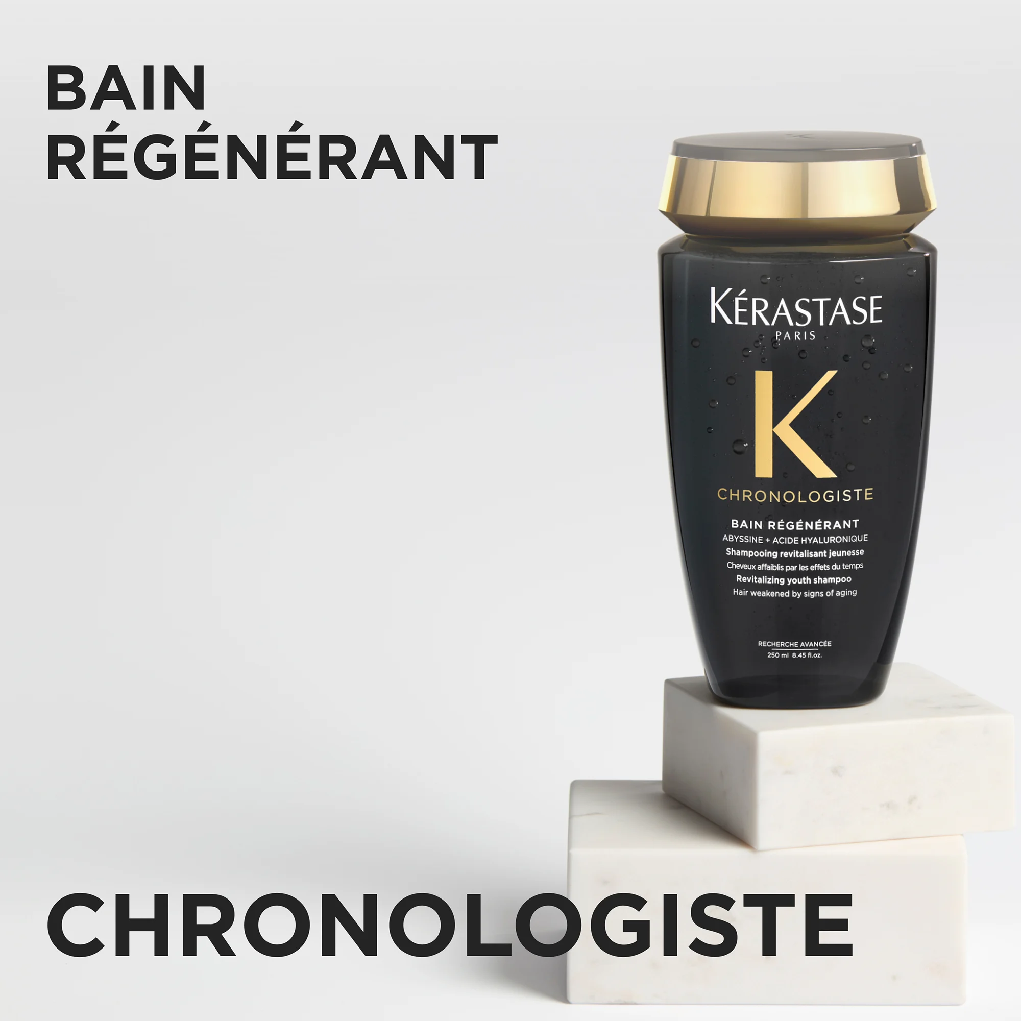 Το Bain Régénérant της Kérastase είναι ένα αναζωογονητικό σαμπουάν νεότητας εμπλουτισμένο με Υαλουρονικό Οξύ και Αβυσίνη, σχεδιασμένο για μαλλιά που έχουν αποδυναμωθεί από σημάδια της ηλικίας, ξηρότητα, θαμπάδα, φριζάρισμα, έλλειψη όγκου και πυκνότητας.