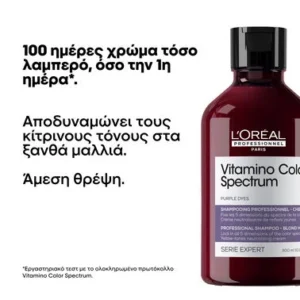 *Εργαστηριακό τεστ με το ολοκληρωμένο πρωτόκολλο Vitamino Color Spectrum. **Εργαστηριακό τεστ μετά τη χρήση του ολοκληρωμένου πρωτοκόλλου Vitamino Color Spectrum μετά από 4 εβδομάδες. ***Για έως 72 ώρες μετά την εφαρμογή, εργαστηριακό τεστ. ****Κατά του φριζαρίσματος, θερμοπροστασία, ενυδάτωση, θρέψη, λείανση, απαλότητα έως και 10 λουσίματα, εργαστηριακό τεστ. *****Εργαστηριακά τεστ.