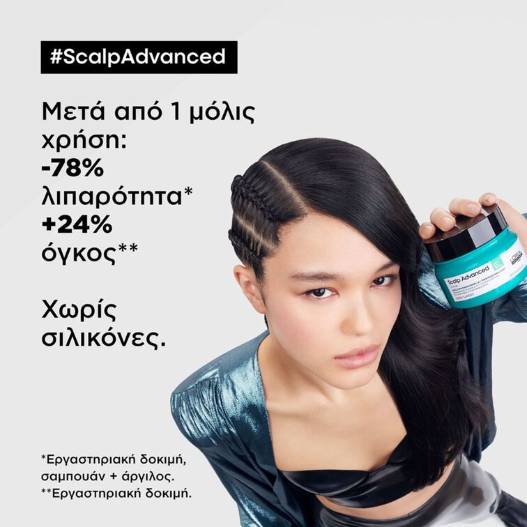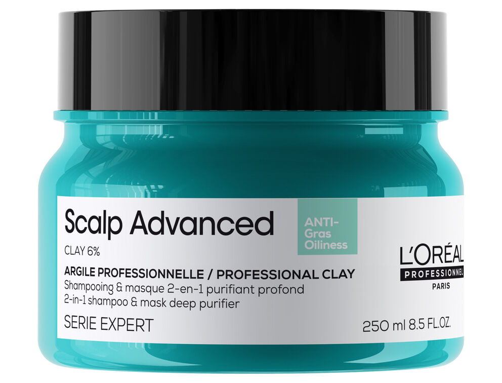 Η Scalp Advanced Anti-Oiliness 2-in-1 Deep Purifier Clay είναι ειδικά σχεδιασμένη για το λιπαρό τριχωτό. Αυτή η ευέλικτη μάσκα αργίλου πολλαπλών χρήσεων μπορεί να χρησιμοποιηθεί είτε ως σαμπουάν για απομάκρυνση των καταλοίπων, του ιδρώτα και του σμήγματος, είτε ως μάσκα για βαθιά εξυγίανση. Δίνει ανάλαφρο όγκο στα μαλλιά. Εμπλουτισμένη με 6% Άργιλο, ένα ενεργό συστατικό λεπτόκοκκης υφής που απολεπίζει απαλά το τριχωτό απαλλάσσοντάς το από τους ρύπους, τον ιδρώτα και το σμήγμα.