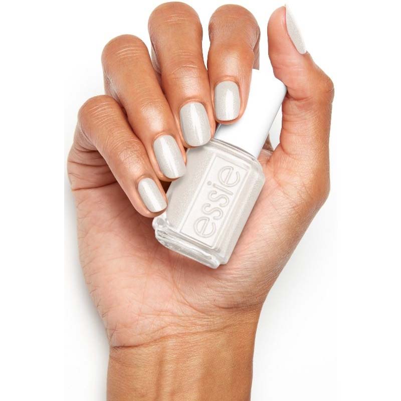 Λευκό βερνίκι νυχιών με γκρι υποτόνους και διακριτικό ασημί shimmer (shimmer).