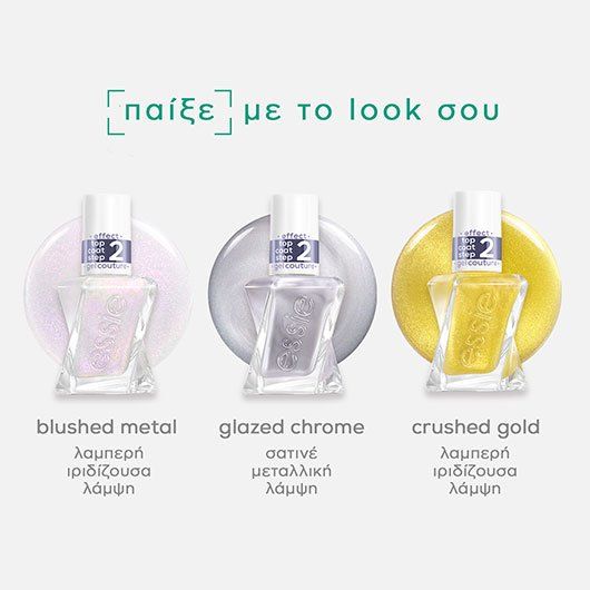 - Συνδύασε το με τα χρώματα Gel Couture της Essie για να δημιουργήσεις το λαμπερό μανικιούρ που ονειρεύεσαι στο σπίτι.