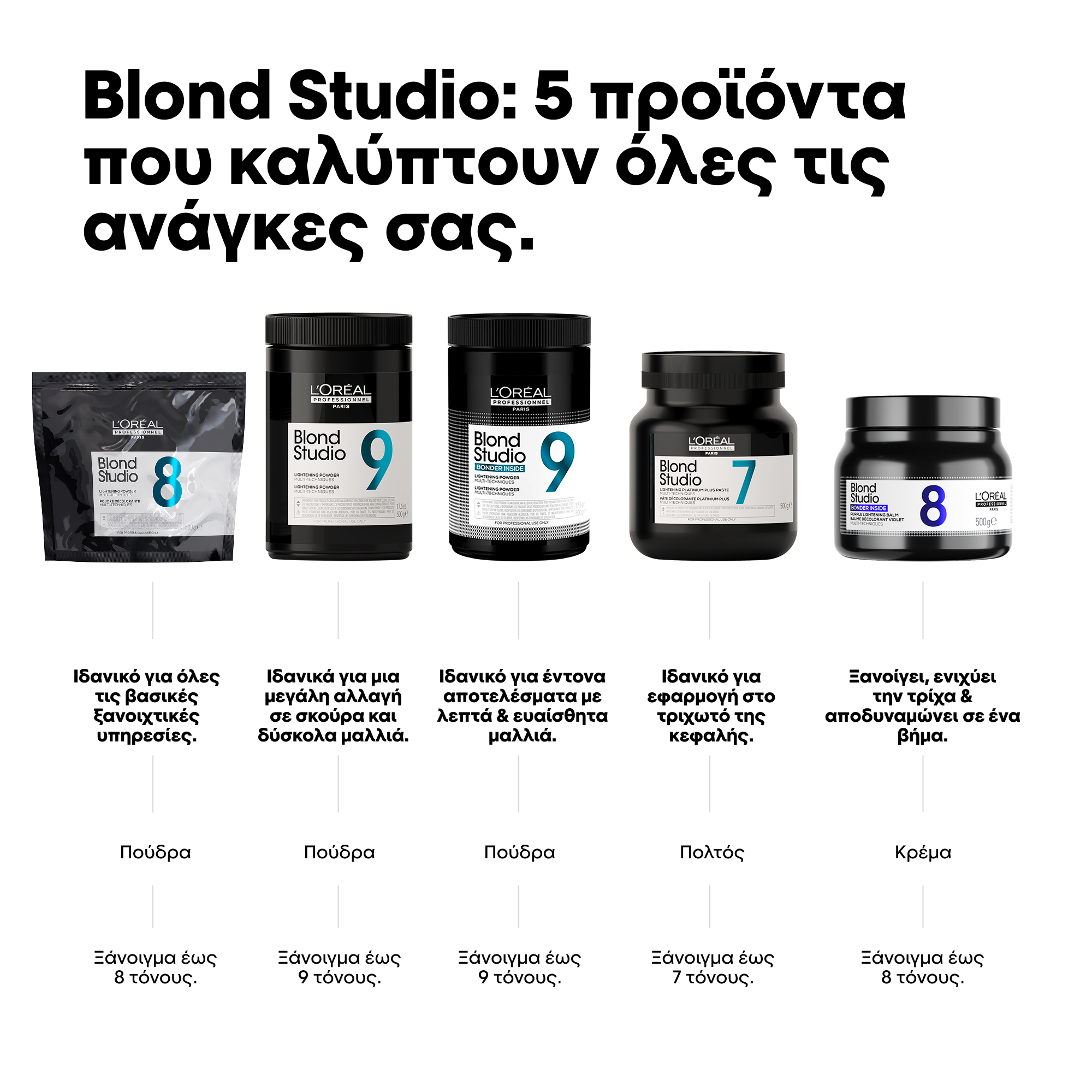 Το Blond Studio 9 Bonder Inside είναι μια σκόνη ξανοίγματος υψηλής απόδοσης με bonder που συνδυάζει υψηλή συγκέντρωση λευκαντικών και συγκολλητικών παραγόντων, για έως και 9 επίπεδα ξανοίγματος με αποδεδειγμένη προστασία ένωσης των δεσμών της τρίχας. Μη πτητική υφή του επιτρέπει τη βέλτιστη προσκόλληση στα μαλλιά. Ιδανική για γυναίκες που επιθυμούν φυσικό χρώμα στα μαλλιά με εκτυφλωτική λάμψη και τέλεια κάλυψη λευκών μαλλιών.